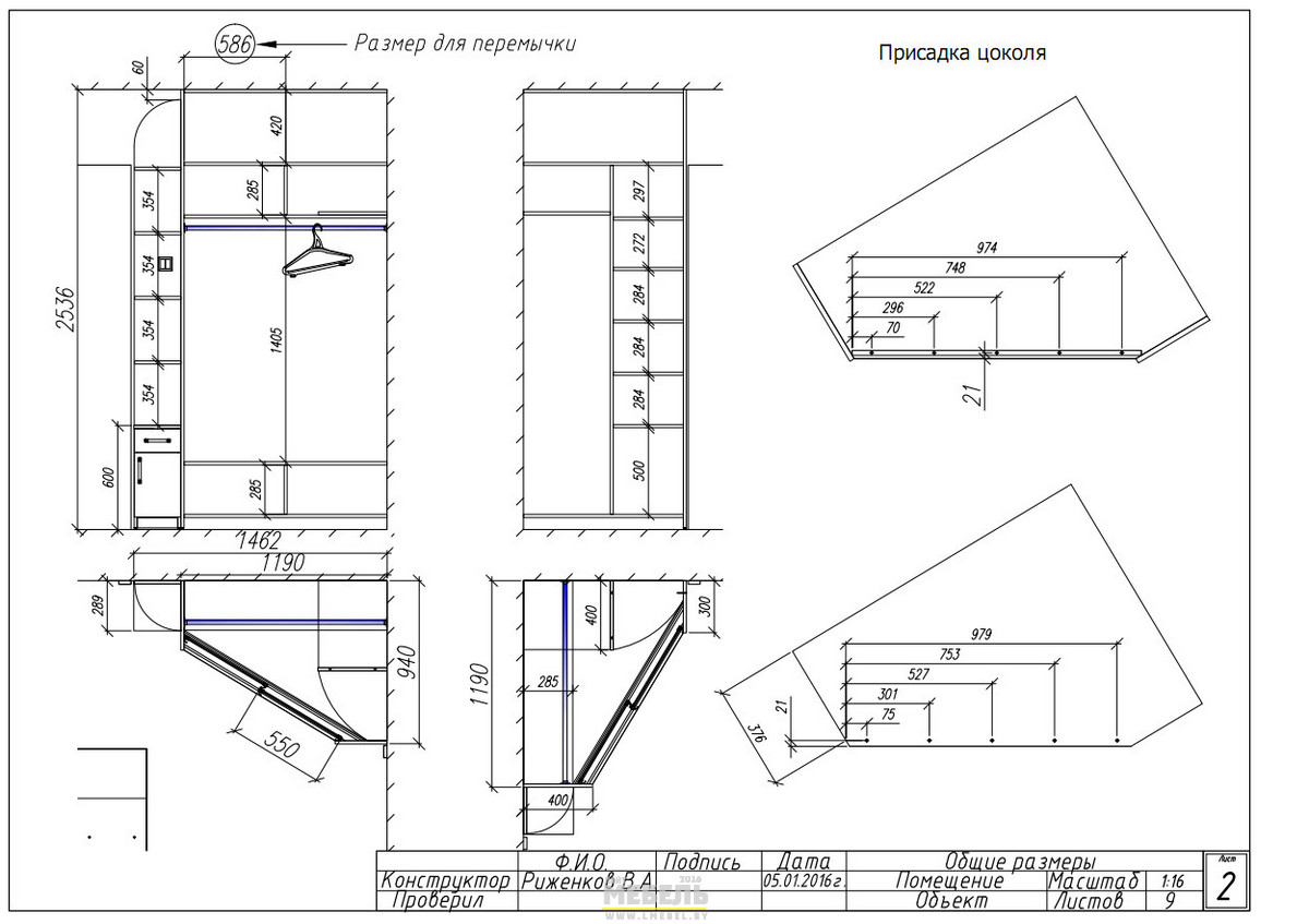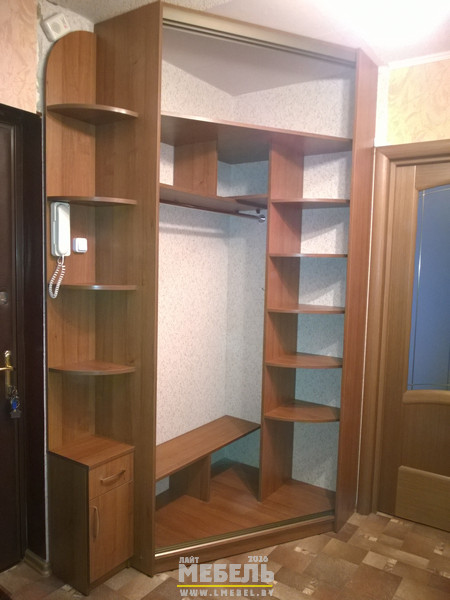 Шкаф-Купе угловой 1,19 х 0,94 м/п. Встроенного типа. Боковые полки 27 см. Двери купе ПЕСКОСТРУЙ Описание изделия: 1. Материал: ДСПл Кроностар 18мм «Орех D722». Лицевые торцы оклеены кромкой ПВХ в цвет корпуса. Шкафы купе в Гомеле под заказ. +375 (29) 376-82-33