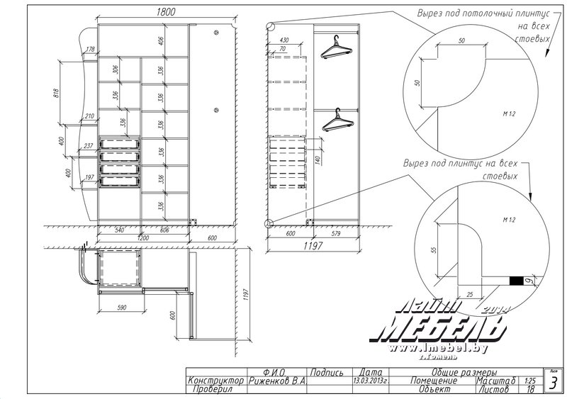 Шкаф-Купе угловой 1,197 х 1,8м. Н= 2,635м, встроенного типа. Боковые полки 30 см. Глубина шкафа-купе 60 см. Описание изделия: